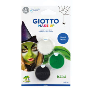 Giotto Witch: tre ombretti – verde, nero e bianco – per streghette birichine e sorridenti. La texture morbida e l’asciugatura rapida rendono ogni gesto un piccolo incantesimo: bastano pochi tratti per trasformare il volto in un ritratto di magia.
