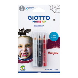 Giotto Vampire: tre matite in legno di cedro certificato PEFC, nei toni bianco, nero e rosso sangue, delicate anche sulle pelli più sensibili. Ogni colore aggiunge un tocco di mistero e fascino, trasformando ogni sorriso in un brivido giocoso.