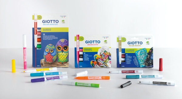 I pennarelli Giotto Decor, ideali per motivi, pattern, texture e finiture brillanti, trasformano ogni uovo in una piccola opera creativa. Creati per diverse superfici creative, nelle declinazioni Metallic, Materials e Textile, sono realizzati interamente in Italia con il 50% di plastica rigenerata certificata, per unire creatività e attenzione all’ambiente. Lo speciale inchiostro, disponibile nei colori classici e metallizzati, aderisce a qualsiasi supporto e si comporta come una tempera, essendo coprente e sovrapponibile.